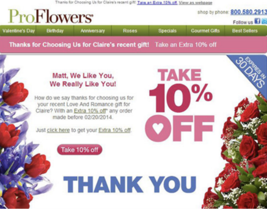 Show your subscriber that you understand them and appreciate them as an individual. Offer them a gift based on what they’re motivated by. For example, if they did abandon a product subscription or their shopping cart, entice them with an extended free trial period, a discount or a promotion on similar, less expensive items. Say thanks for their past interest or purchases, and personalize the email by using their first name, like this email from Proflowers: