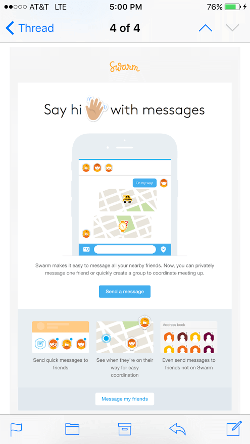 Swarm ist eine App, mit der Sie Ihren Standort ganz einfach mit Freunden teilen können. Ein wichtiger Bestandteil der E-Mail Marketing Aktivitäten von Swarm war eine frühzeitige Werbekampagne für neue Benutzer, um ihnen eine neue Funktion vorzustellen. In diesem Fall Nachrichten.