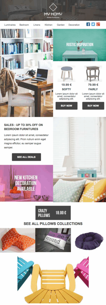 Dabei handelt es sich um eine E-Mail Vorlage mit allen Arten von Abschnitten, die Ihre Teams benötigen: Header, Signatur, Menü Ihrer Website, Links zu Ihren sozialen Netzwerken; kurzum alle Elemente, die Sie für die Erstellung Ihrer Newsletter oder Bestellbestätigungen brauchen, müssen enthalten sein.