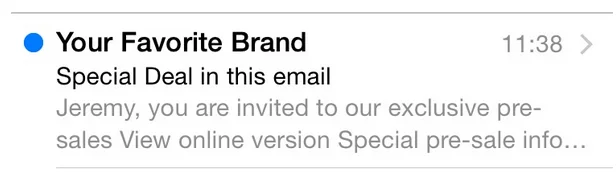 Fíjate cómo en el ejemplo anterior hemos utilizado la opción de personalización para añadir el nombre del cliente en el pre-encabezado. Esto se puede utilizar en combinación con un título de asunto personalizado. En algunos casos, los destinatarios responden bien a los asuntos personalizados la primera vez, pero si este recurso se repite varias veces, acaban perdiendo el interés. Los clientes pueden sentirse molestos si se les recuerda constantemente que sus datos personales están almacenados y se utilizan tan alegremente. La personalización obliga a mantener un delicado equilibrio y aplicar este concepto en el pre-encabezado debe consistir en encontrar un modo sutil de seguir siendo relevante sin que el destinatario se sienta observado por el Gran Hermano.