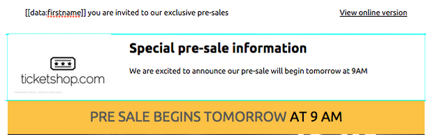 ¿En qué se diferencia un pre-encabezado normal de un pre-encabezado de éxito? Echemos un vistazo a los dos ejemplos que se muestran a continuación. En el primer email se puede ver cómo el emisor se dirige al destinatario por su nombre y le da suficiente información como para captar su interés: “Te invitamos a nuestras preventas más exclusivas”. Lo normal es que esto deje al destinatario pensando “¿cómo de buena será esa preventa?” y sintiéndose especial por haber sido incluido en la reducida lista de gente que ha recibido esta exclusiva oferta.