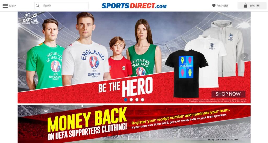 La tienda inglesa SportDirect ha lanzado una promoción con motivo de la Eurocopa de Francia, en la que animan a sus clientes a comprar las equipaciones inglesas prometiéndoles que les devolverán el dinero si Inglaterra gana la Eurocopa… igual que hizo en España Media Markt en 2010, cuando al final La Roja acabó ganando el Mundial.