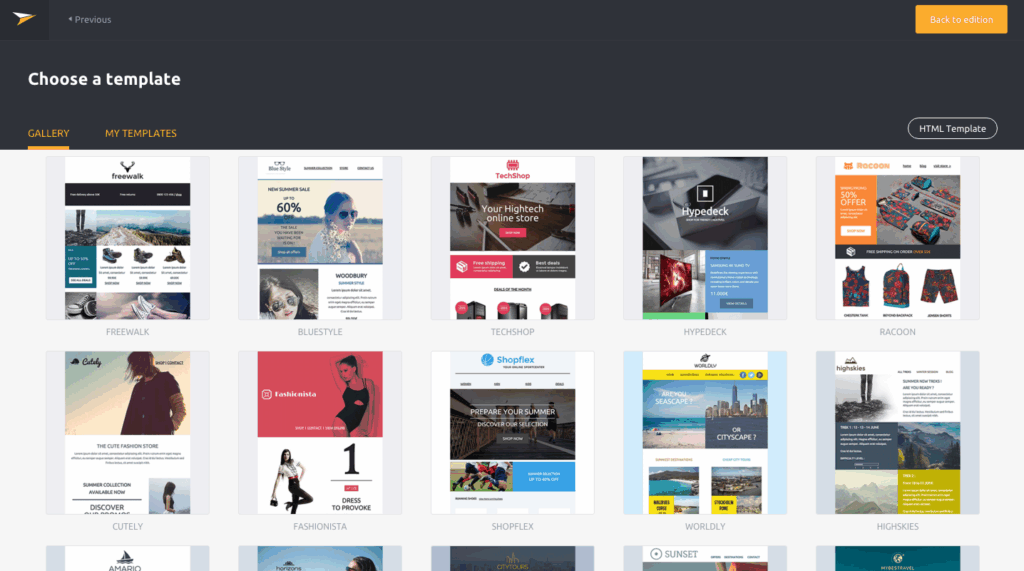 Esta nueva versión brinda acceso rápido a las plantillas preestablecidas de Mailjet, una galería con tus plantillas personalizadas y la opción de crear tus propios diseños de emails en HTML.