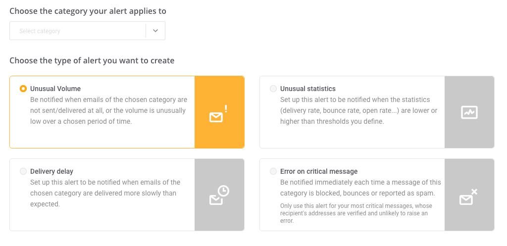 En este ejemplo, hemos decidido clasificar nuestros emails transaccionales en distintas categorías para poder configurar alertas específicas de cada una de ellas: