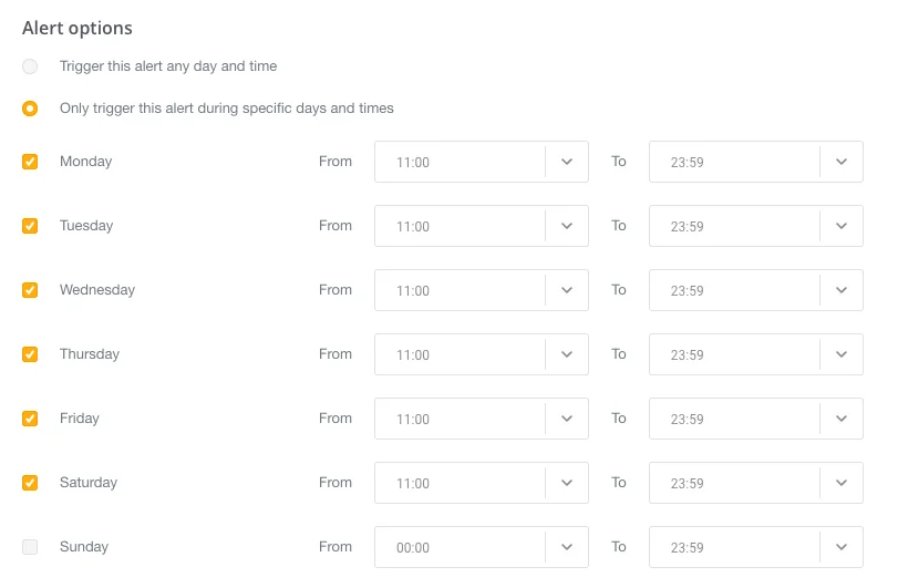 La supervisión en tiempo real de Mailjet te permite definir las horas y los días durante los que activar una alerta y el canal de notificación. De este modo, puedes programar alertas en Slack y por email de lunes a viernes durante tu horario de oficina, y crear la misma alerta para recibir notificaciones por SMS* fuera del horario laboral.