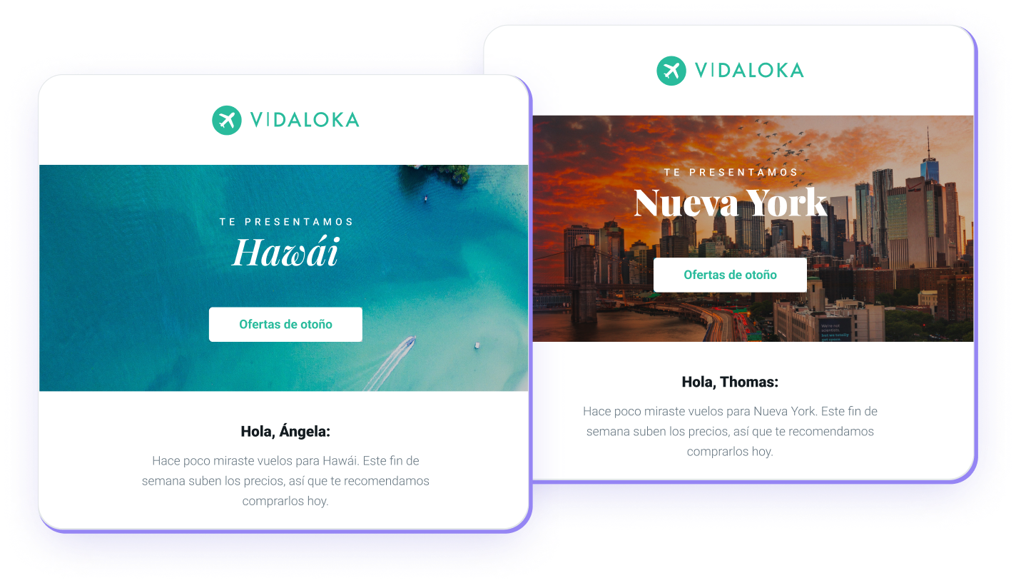 Estos dos ejemplos representan correos personalizados de una campaña de la misma empresa de viaje. Ambos utilizan el nombre de pila del contacto, que la empresa recopiló durante el registro.