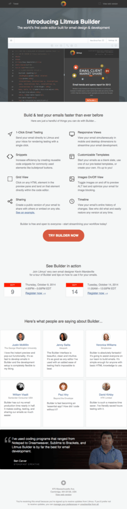 Dans le cas des appels à l’action, un design percutant sera très différent pour une vente flash et pour le lancement d’un produit. L’email de lancement de Litmus Builder est un parfait exemple de la façon dont le design met en avant le message central. Les deux calendriers rouge et blanc attirent l’œil vers l’inscription à la visite virtuelle du produit. La grille met également en avant les témoignages des clients, avec une bannière sombre et plus large en bas, qui complète la bannière d’en-tête.