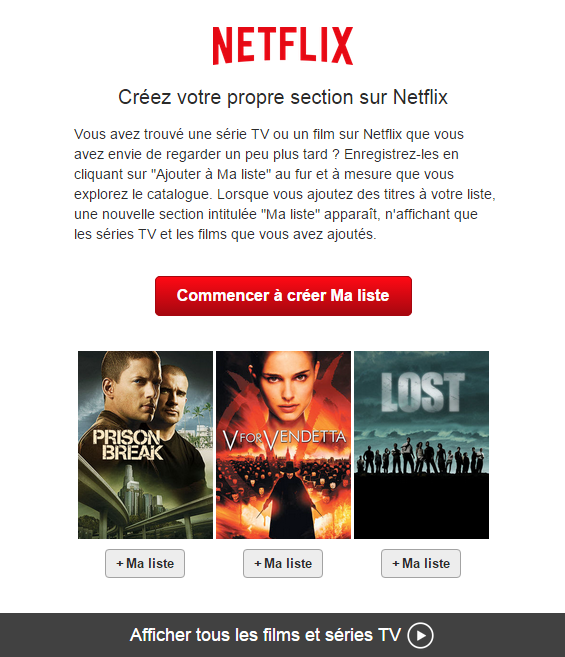 Dans ses campagnes de drip marketing, Netflix fait toujours en sorte que ses appels à l’action soient clairs, visibles, et mènent à une expérience utilisateur toujours meilleure, qu’il s’agisse de la découverte même du service (ici, la fonctionnalité de liste personnelle), ou bien de recommandations basées sur les comportements du client.