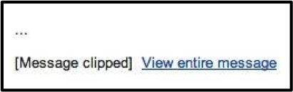 Gmail raccourcit les emails HTML dont la taille est supérieure à 102 Ko, en n’affichant que les 102 premiers kilooctets et en coupant la suite. Le lecteur verra apparaître le message et le lien suivants, qui permet d’afficher le reste de l’email. Le message peut varier selon l’appareil utilisé.