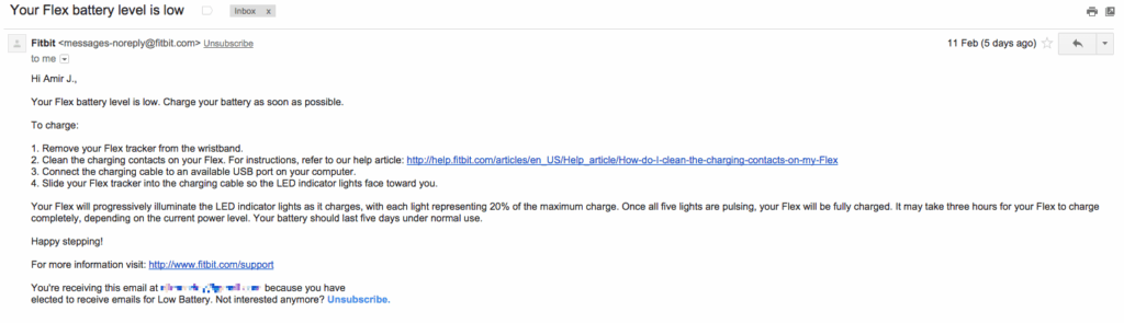 Ainsi, Fitbit, société connue pour ses vêtements et accessoires connectés, avertit le porteur par email lorsque le niveau de la batterie de son bracelet Fitbit Flex est faible, et lui indique comment le recharger. L’utilisateur peut ainsi mettre son dispositif en charge. Simple, mais efficace ! En outre, Fitbit fournit un lien de désinscription lisible pour l’utilisateur qui ne souhaiterait plus être dérangé par de telles notifications.