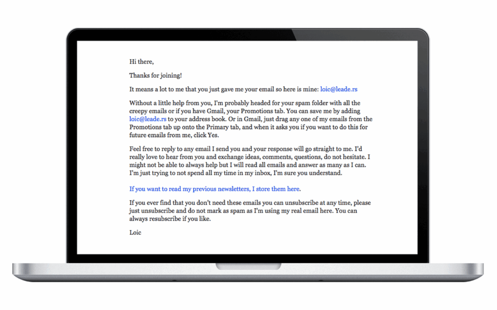 Loïc Le Meur n’est pas développeur : pour éviter d’avoir à coder lui-même ses scénarios, il a opté pour les outils d’automatisation email développés par Mailjet pour créer facilement son scénario de bienvenue, déclenché dès l’abonnement. Dans la plupart des cas, ce type de scénario est une série d’emails envoyés les uns à la suite des autres. Mais Loïc Le Meur a choisi de faire simple avec un seul email au ton très personnel, contenant son adresse et plusieurs astuces pour éviter que les emails de sa newsletter n’atterrissent en spam ou dans l’onglet « Promotions » de Gmail.