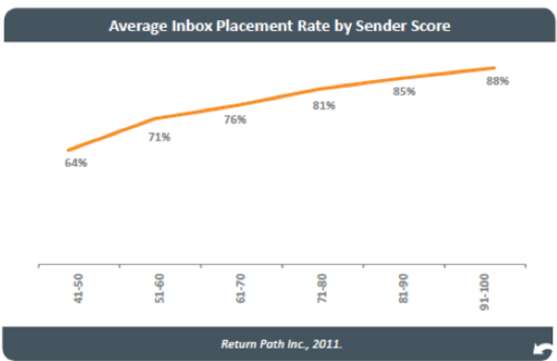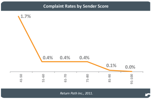 Avec un score oscillant entre 41 et 50 sur 100 (soit un taux de 1,7% de plaintes pour spam), votre taux de placement en boîte de réception n’est plus que de 64%. Notez d’ailleurs que c’est là le meilleur scénario ! Il peut aussi y avoir un blacklistage qui bloquera tous les messages transitant par l’IP utilisée…
