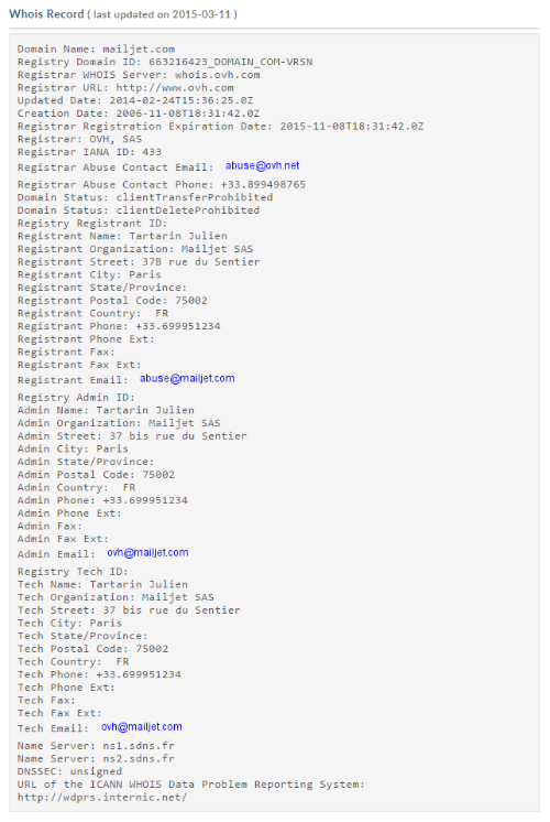 Exemple : avec le WHOIS, on sait que « mailjet.com » est détenu par « Mailjet SAS, 37 bis Rue du Sentier, 75002 Paris »…